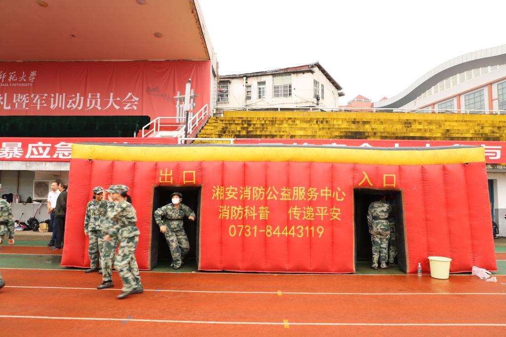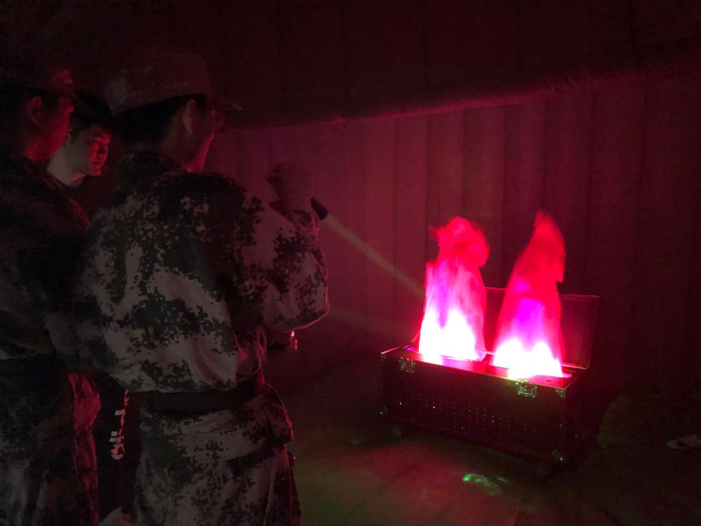 同学们在工作人员的指挥下,依次进入火灾模拟室和模拟灭火体验馆进行消防演习。